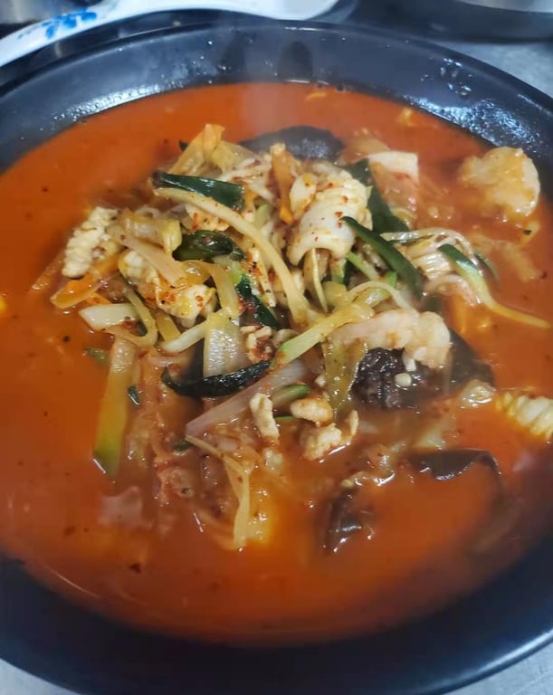 Stir fried vegetable with seafood and pork in Korean chili powder and seasonings, then cooked with broth served over noodles.