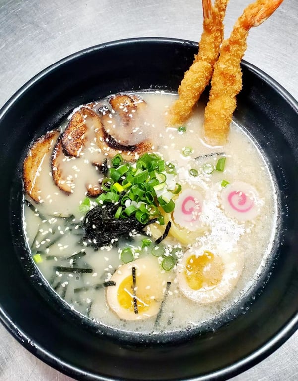 Rich pork bone broth with roast pork, fish cake, soy sauce, egg and 2pcs shrimp tempura. Topped with scallions seeds and seaweed.