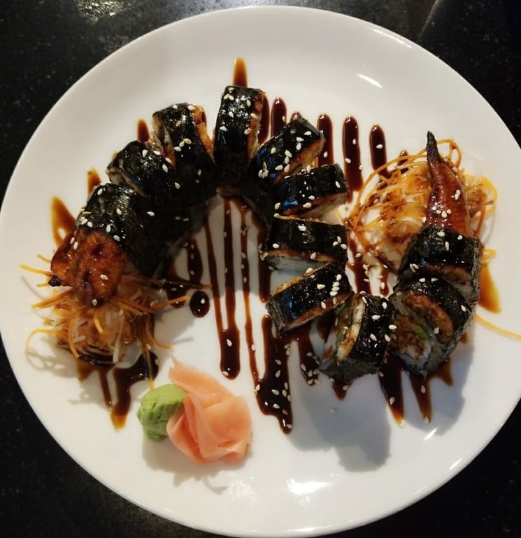 Cucumber avocado krabmeat topped with whole eel and eel sauce
