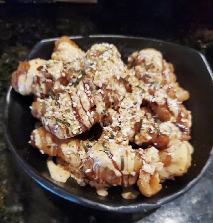 fried chicken with spicy mayo ,eel sauce and Japanese seasoning