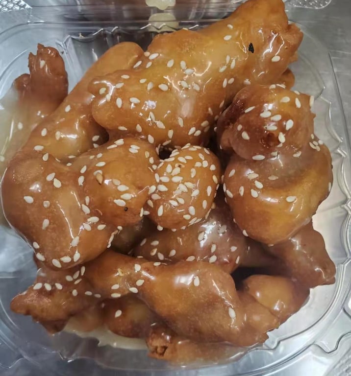 Fried chicken pc with sweet white creamy sauce and seeds