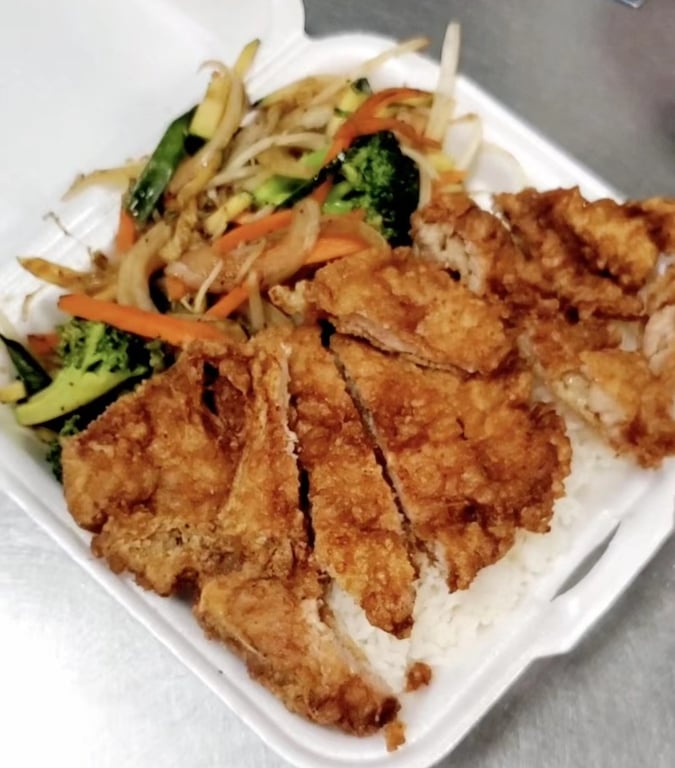 Taiwanese marinated pork chop coated and fried, paired with mixed veggies and miso soup (Steam rice included)